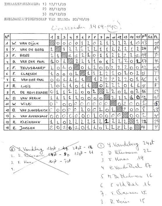 Eindstand (2 ronden) : Behaalde punten Totaal punten 1) Yves Vandeberg 20 ptn. 24 ptn. 2) Marc De Meulenaere 14 ptn. 24 ptn. 3) Roger Kleinmann 14 ptn. 24 ptn. 4) Anton van Drumpt 13 ptn. 24 ptn. 5) Eddy Janssen 8 ptn. 24 ptn. 6) Raoul Alias 7 ptn. 12 ptn. 7) Luc Jennes 5 ptn. 24 ptn. 8) Franz Thuysbaert 2 ptn. 12 ptn.