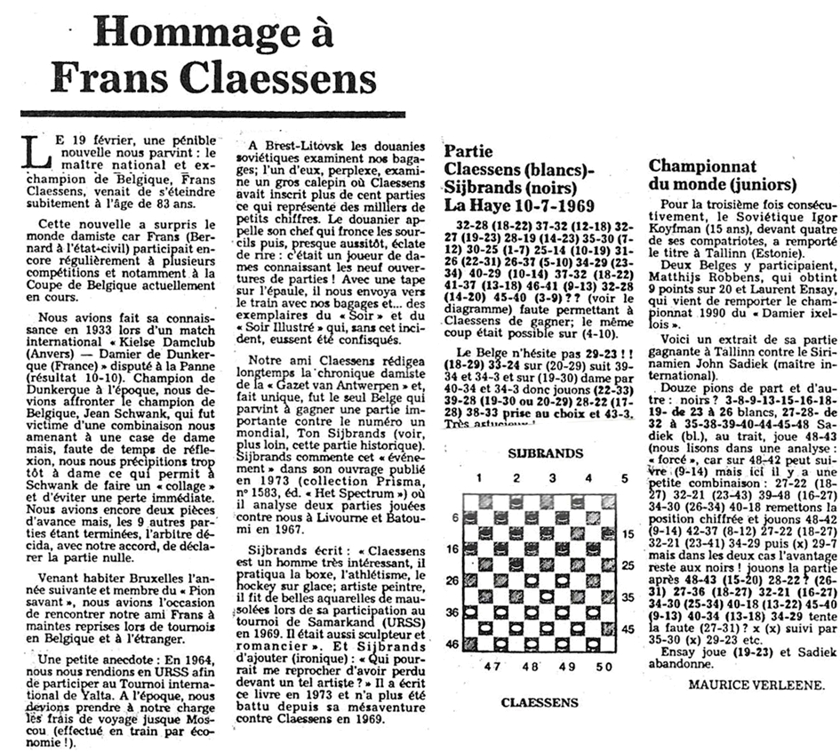 | "Le Soir" : 14/03/1990 Artikel betreffende een hommage aan Frans Claessens van Damclub Brabo Antwerpen |